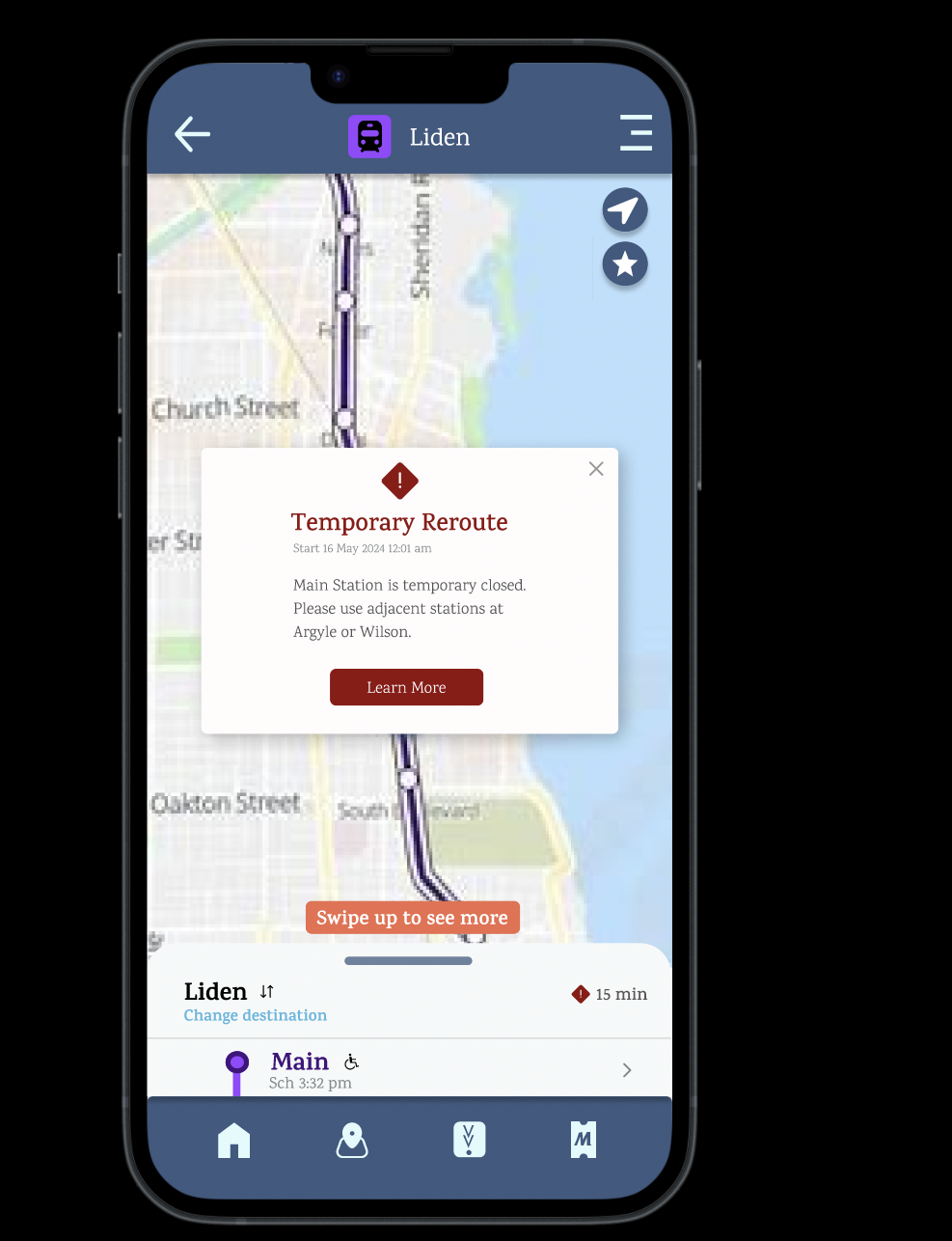 To prevent errors and improve accessibility, I implemented a full-screen warning sign when users search for a route with potential issues.