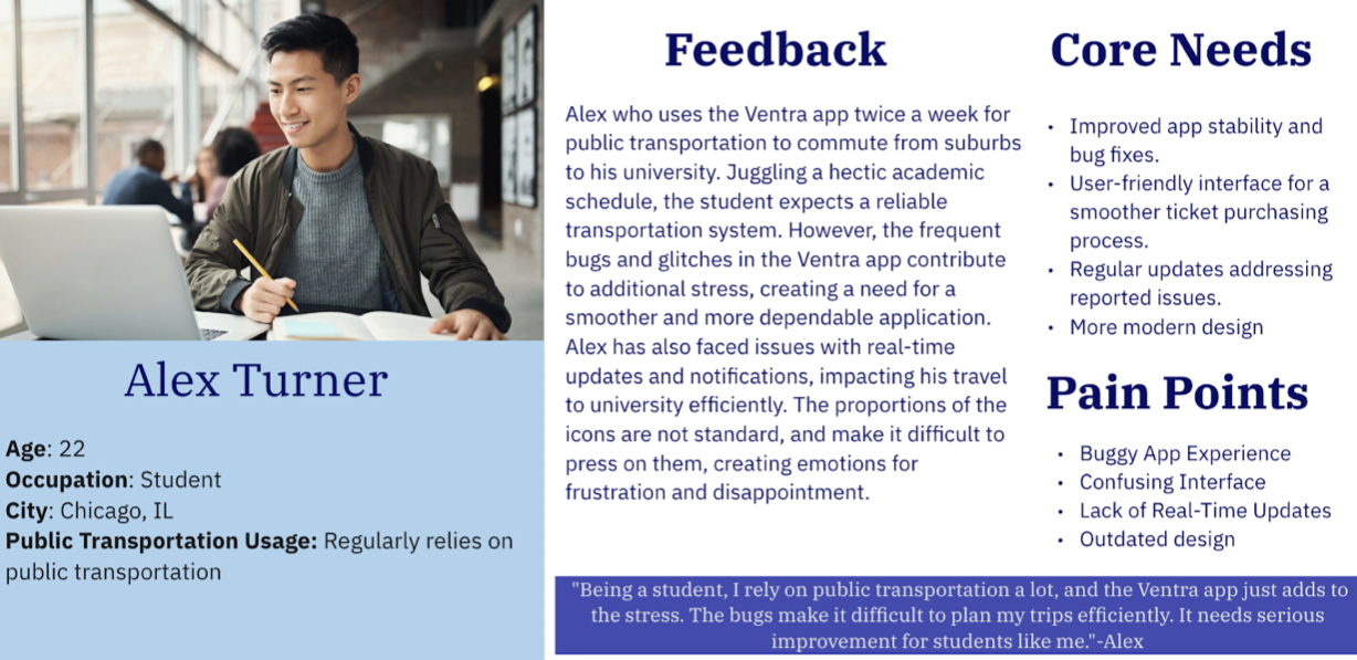 Despite facing these challenges, Alex remains committed to using public transportation and the Ventra app for its convenience, hoping for improvements in the user experience.